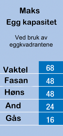 Maxi 48 Advance rugemaskinen rommer 48 hønseegg takket være Brinseas innovative system med eggkvadranter. Disse kvadrantene klikkes enkelt sammen for å tillate at egg av én størrelse eller forskjellige størrelser ruges sammen når man bruker artsspesifikke kvadranter. Leveres med høne- og andekvadranter som standard.