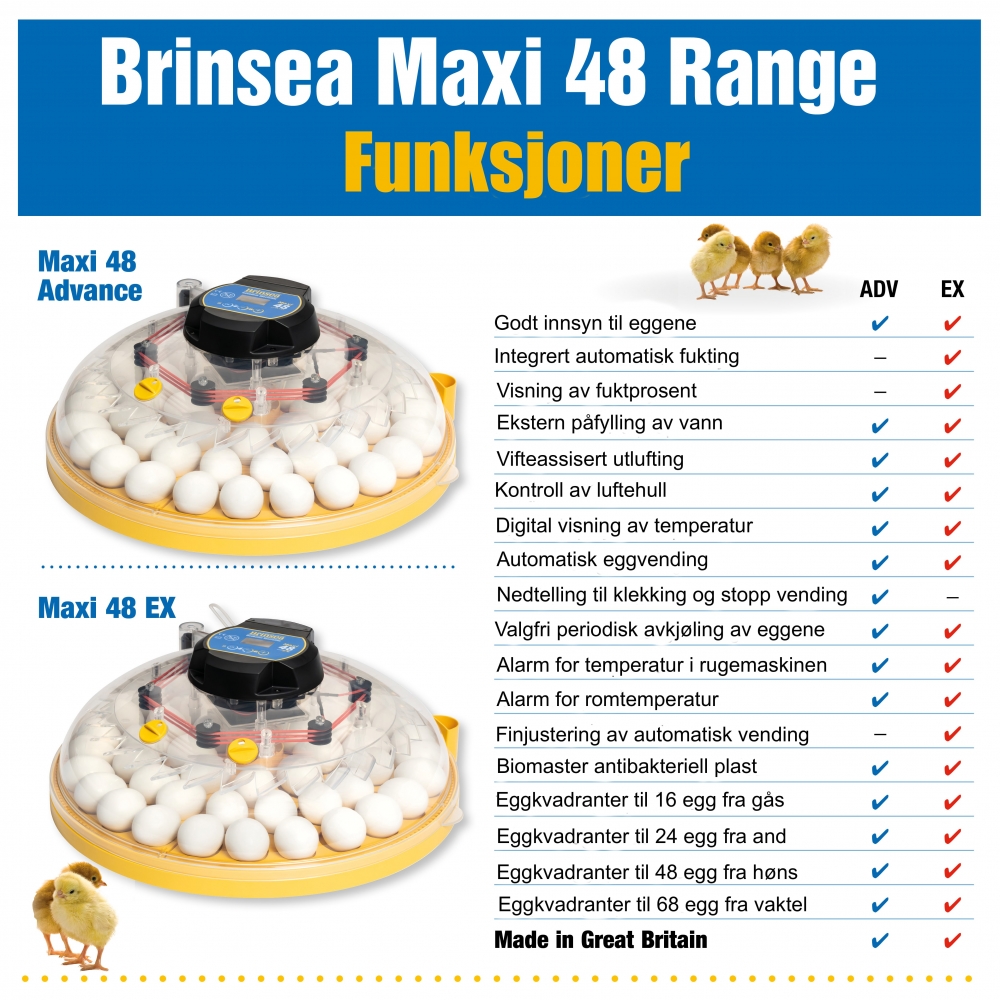 Med god synlighet av rugeeggene og praktisk ekstern vannpåfylling, fjerner den gjettingen fra rugingen. Maxi 48 Advance snur egg automatisk og gir digital kontroll av temperaturen. Brinsea,s patenterte alarmer varsler om ruging og romtemperatursvingninger, og denne maskinen har også en strømbruddindikator.